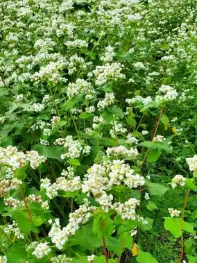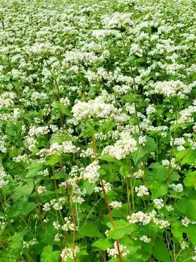 Buckwheat flowers are annual plants of the Polygonaceae family, and bloom from May to June and August to September. Small white or pale pink flowers bloom in a raceme at the tip of the stem. They are also characterized by their large heart-shaped leaves.