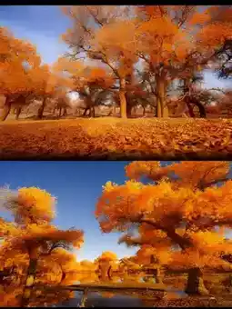 Golden Populus Euphratica + blue sky and clear water, this oil painting-like scenery is outrageously beautiful!