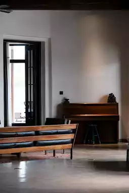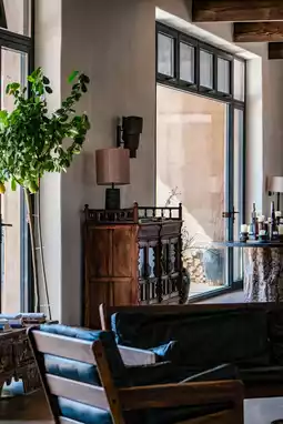 Opening the wooden door to the courtyard suite reveals poetic immersion - leather accents, wool carpets, cashmere throws, and deep brown leather sofas whispering tales of bygone eras, harmonizing with raw wood coffee tables. Vibrant wall tapestries hide celestial legends of Ordos herders. Floor-to-ceiling windows frame the courtyard as living art, with withered branches casting Zen shadows across minimalist loungers. Books stack casually on rugs as music floats through stories, while flickering flames in the functional fireplace murmur about time's passage.