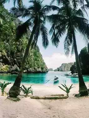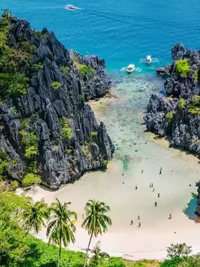 Hidden Beach in El Nido, Palawan, is named from the white beach, azure waters, and towering karst rocks that cover it. To get to the shore, you can swim or kayak from your boat. One of the highlights of the El Nido island hopping tour C package is this.