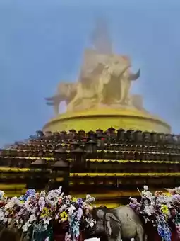 The Golden Summit, also known as the Huazang Temple, was built during the Tang Dynasty and has a roof covered with tin tiles. Here, visitors can enjoy the four wonders of Mount Emei: the magnificent sunrise, the ever-changing sea of clouds, the mysterious Buddha's light and the wonderful holy lamp. Although Mount Emei is shrouded in clouds for more than 270 days every year, we were lucky. It had just rained before we arrived at the scenic area, and the scenic area was still shrouded in clouds. The Golden Summit and the Golden Buddha were looming in the sea of clouds, as if covered with a mysterious veil.