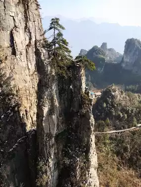 Old pine trees rooted in the crevices of the rocks and the rural scenery that spreads far below