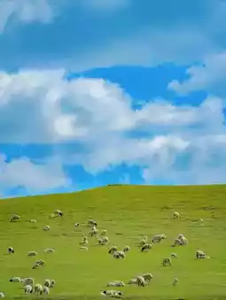 Herds of cattle and sheep graze leisurely on the slopes, against the sky and beneath the white clouds