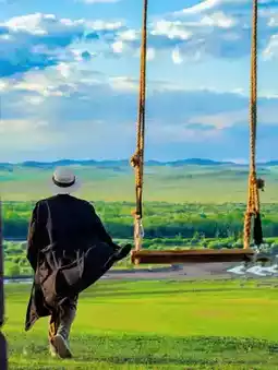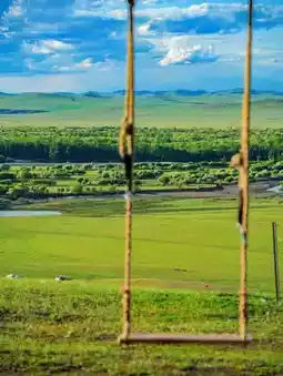 On the hillside, swinging in the breeze, swinging on a swing