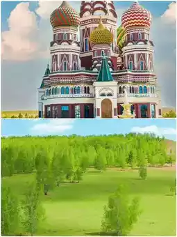 The building of Matryoshka Square is illuminated by lights, surrounded by colorful Russian-style houses ~