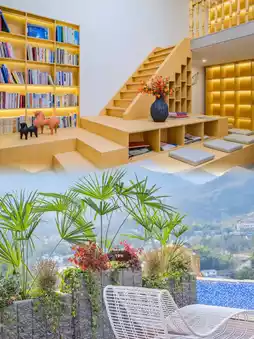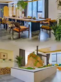 There are many indoor public areas, all of which are decorated with an artistic touch, making them perfect for company team-building or family trips. There is a book bar, pool table, KTV, chess and card room, and restaurant. There is also a large solid wood tea table, where a group of people can drink tea, chat, and play murder mystery games. The atmosphere is great. Various leisure sofas, tables, and chairs can be seen everywhere. The coffee machine next to the restaurant allows you to make your own coffee. Outside the homestay, there is a camping-style leisure area, and the homestay's dog will also play with you. It's very cute.