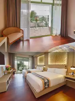 What I remember most is the time I spent watching the sunset on the hotel's private beach. Standing on the soft white sand, the sea breeze gently blowing on my face, the orange-red sunset slowly sinking into the horizon, the sky gradually changing from golden to dark blue, the whole world seemed to be left with only me and this endless scenery. At that moment, all my worries seemed to fade away with the tide, leaving only peace and joy in my heart.