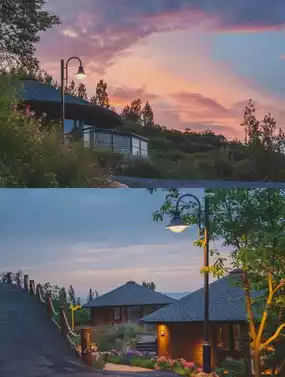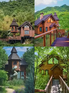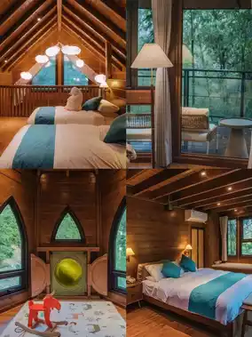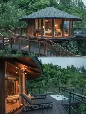 1️⃣There are a total of 26 wooden villas, with three family-friendly units perfect for family trips—two floors with a queen bed downstairs and a kids' play area + two single beds upstairs. The other cottages are ideal for couples, featuring romantic balcony bathtubs and stunning city views from the mountaintop.