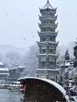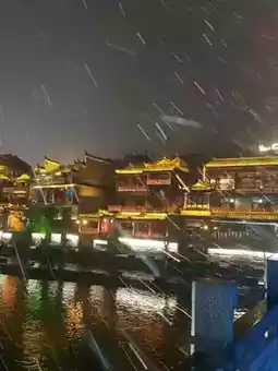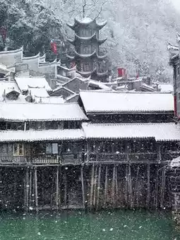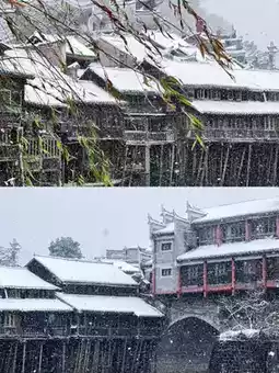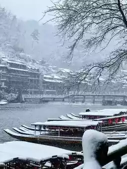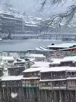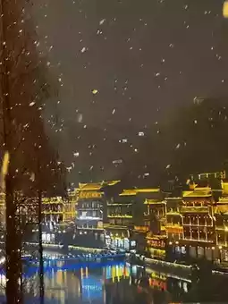 Especially at night, the lights of the ancient town and the reflection of the river complement each other, and the snowflakes fall on the street, adding a mysterious veil to the ancient town.