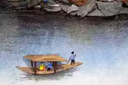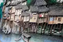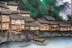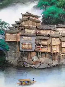 It's one of only two sand-and-stone paintings I still have, depicting a real scene from Fenghuang Ancient Town: Mr. Huang Yongyu's Duocui Tower. It stands on the left bank of the Tuojiang River, backed by Tianma Mountain and facing Hong Bridge. It's a contemporary imitation-archway-style building with long stilts over the water, a suspended platform, and upturned eaves. It features traditional Xiangxi square and rectangular lattice windows, giving it a unique, ancient, and elegant appearance. It blends seamlessly with the surrounding stilt houses, possessing significant artistic character. Friends who visit Fenghuang and take a boat tour will all pass by it. Personally, I think it's the most beautiful cluster of stilt houses along the Tuojiang River in Fenghuang Ancient Town~