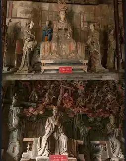 The colored sculptures in the Hou Tu Holy Mother Hall are also worthy of praise. Among them, the "Mother of God" holding a baby and breastfeeding her child on the north wall is a good example. She sits under the magnificent hanging sculpture with a kind and gentle expression, which moves the viewers.