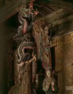 In the Hall of the Five Mountains, the main god is the god of Mount Tai, the Eastern Peak. The pillars in front of the other four mountain gods are all decorated with clay flying dragons. The four colored dragons of "yellow, red, white and black" correspond to the four mountains of "Song, Heng, Hua and Heng". These colored dragon pillars represent another peak of Taifu Temple's colored sculptures, and have become an example for reference in the restoration of ancient buildings in Fenyang area. Due to the rule that “the main god never goes out”, the God of Mount Tai does not have a blue flying dragon serving him.