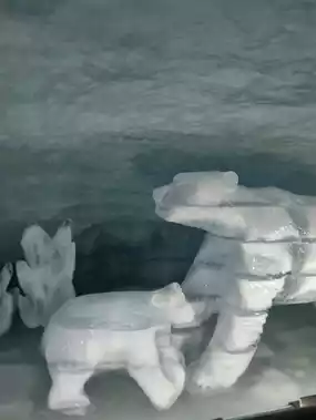 Once inside, you are surrounded by transparent ice walls. The floor, ceiling, and pillars are all made of ice, illuminated by soft lighting that casts a bluish glow throughout the space. Various ice sculptures of animals like bears, penguins, and eagles are displayed, making it feel like walking through an art gallery inside a glacier. The floor is smooth but very slippery, so walking slowly is essential. Despite the cold air, the clear and transparent atmosphere felt refreshing.