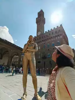 There's also a pavilion for cool air and free water. The completely open-air replicas of famous artworks are available for photo opportunities. Nearby are the Loggia della Signoria, the Palazzo Vecchio, the Fountain of Neptune, and the Uffizi Gallery. Florence's Town Hall, with its tower offering panoramic views of the city, is also worth a visit. While in the square, stop by the Fontana del Porcellino, the Wild Boar Fountain, a place where many people would drop coins in hopes of wealth.