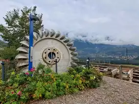 The bell tower of the old parish church of Graun is a 14th-century steeple that rises mysteriously from the center of Lake Reschen (Reschensee) in South Tyrol, Italy. The tower is the sole visible remnant of the village of Altgraun (Old Graun) and the former parish church of St. Catherine, which were intentionally flooded in 1950 to create a hydroelectric reservoir.