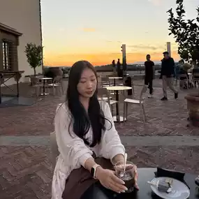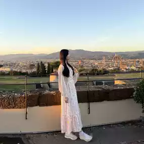 Climbing up the hill right next to the fortress, I came across this cafe and restaurant, and the view from there was truly breathtaking. 💛 The panoramic view of Florence, the silhouette of the Duomo, the crimson rooftops, and the golden sky were truly a work of art. 🎨 Sitting on the terrace, sipping coffee, and watching the sky gradually turn orange, I thought, "This is the true leisure of Europe."