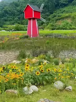 An artistically rich village with a huge red chair perfect for photos. Surrounded by mountains, you can enjoy lotus flowers🪷 and a large sea of sunflowers🌻. In the morning, accompanied by mist☁️, it feels like a fairyland~