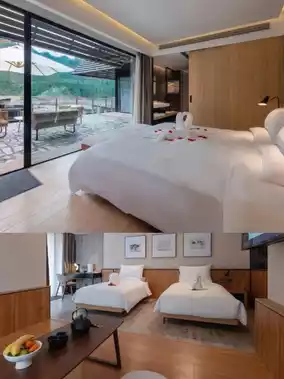 Nearby check-in spots include Shawo Hundred-Mu Flower Sea and Dawan Mountain Cornelian Cherry Tourist Garden. The hotel offers free pick-up service from Foping High-Speed Rail Station and free parking for self-driving guests. There are standalone courtyards themed around the "Four Treasures of Qinling" (giant panda, golden snub-nosed monkey, takin, crested ibis), as well as panoramic balconies and scenic bathtubs. Open the window to see the mountains and be surrounded by a sea of flowers.