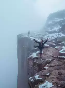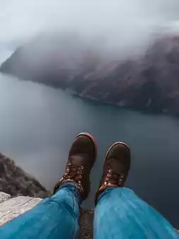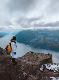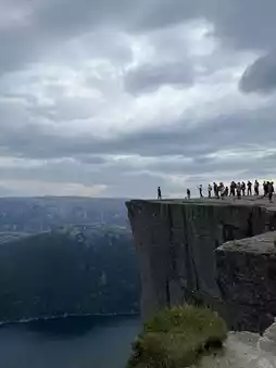 This is a true trek, taking about 10–12 hours round trip. The trail leads through rocks, streams, and snowy patches. At the top, you'll reach one of Norway's most iconic spots: the edge of a cliff over an abyss, where you feel like you're standing on the edge of the world.