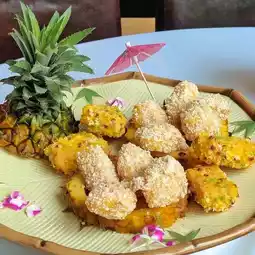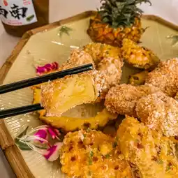 The fried pineapple is wrapped in oatmeal crisps, the taste is sour and sweet and very appetizing!