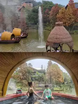 The Southeast Asian style Tang Valley design is unique, with a wooden boat hot spring pool in the center of the small lake, occasional fog over the water, and rows of red bald cypresses on the opposite bank, creating a very artistic atmosphere