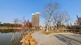 Qiandeng Lake Park is divided into the South District and the North District. The North District is relatively quiet and sparsely populated, with garden landscapes. The wooden plank paths in the lake are lined with Metasequoia glyptostroboides, and there are small fish swimming in the water, which is particularly peaceful.