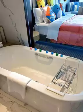 The room is full of rubber ducky elements, with exclusive toiletries, bathrobes, and slippers, as well as a tent and a block table. My daughter was so excited she screamed. There are also picture books in the room, perfect for a cozy family reading time.