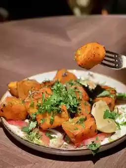 The prawns are really big, and the meat is chewy when you eat it. They are seasoned with Indian spices and served with lemon juice and onions to make the prawns more flavorful.