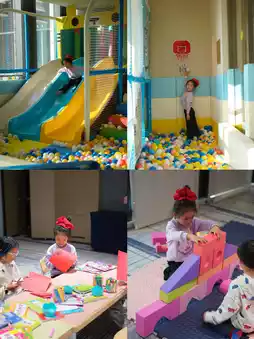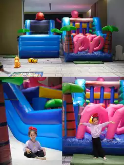 The bouncy castle, building blocks, and coloring books on the first floor,