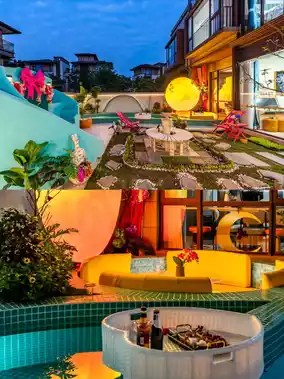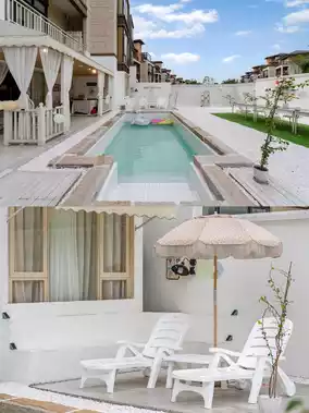 ✅ There are sun loungers in the courtyard, and there is a luxurious large swimming pool. The warm sunshine at noon fills the courtyard. After sunbathing, turn around and jump into the swimming pool to play in the water. Who is not confused?
