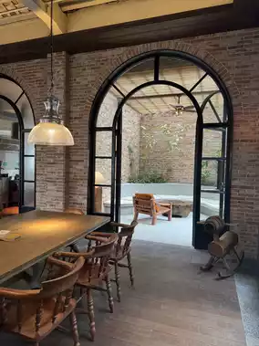 Zhiyu Homestay is located in the Little Bear Dream Garden Park at No. 22 Yanjiang Road, Daliang Street. The park covers an area of about 10,000 square meters and a construction area of more than 14,000 square meters. It retains 6 industrial buildings built in the 1960s and 1970s. The blue tiles and red bricks have a strong mark of the times and are a vivid witness to the establishment of Shunde as an industrial county. Its predecessor was the East-West District Cloth Factory founded in 1960, and was converted into a cotton weaving factory in 1964 and Shunde Daliang Plastic Weaving Joint Venture Factory in 1983. With the development of the city, the First Wharf, Huagai Road Pedestrian Street and Jinbangshang Street adjacent to the Little Bear Dream Park have formed mature cultural and tourism business districts. The park has been renovated and upgraded to include more diverse and richer business formats such as the Buqi Pavilion public art exhibition hall, Zhiyu B&B, Zhishanfang private kitchen, Wei Space catering, Chimney Coffee, and Tea House, creating a model for the revitalization of old buildings.
