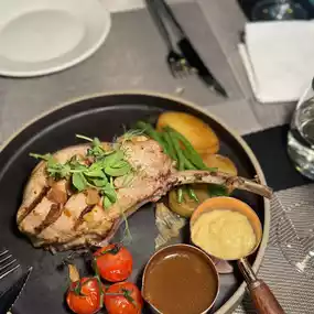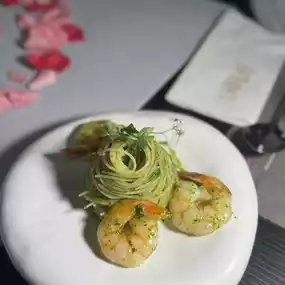 The starter is crispy tuna tartar, which is super exquisite✨, served with a day salad🥗 and mushroom soup🍄🟫. Main course: Battle ax pork chop thickly sliced, juicy to the point of leaking meat juice😋. Another angel noodles hung with green sauce and bouncy prawns go well together🦐.
