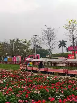Coming out of Happy Island, you can see the yellow trumpet tree 🌼, and coming out of the Fairy Tale Ranch is the Rainbow 🌈 Flower Field near the entrance of the park, with all kinds of beautiful flowers - cherry blossoms 🌸, violets, geraniums 💐, etc., and there is also a flower field train 🚃 to ride. You can enjoy the flowers before leaving the park. It is evening at this time, the sun will not be too strong, and it is also good for taking pictures.
