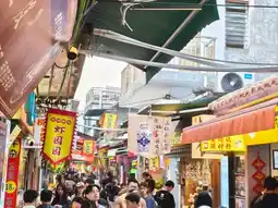 A traditional food street with nostalgic architecture, many people line up to buy freshly grilled eel, buffalo milk desserts, traditional white sugar cake, experiencing the lively local atmosphere🥛🍴🥤🥢