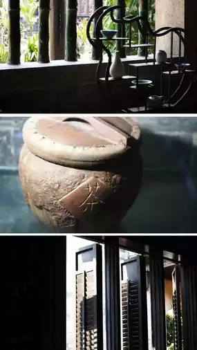 Shenliu Hall: The hexagonal blue and white glass windows complement the red background floral inlays, and the Qing Dynasty wood-carved screen adds to the charm.