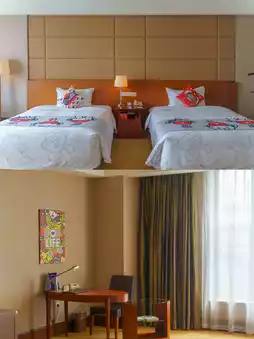 The Strawberry Bear-themed room will make you and your BFF squeal! 🍓 From cloud-like bedding and plush pillows to dainty decor, it’s a strawberry bear paradise! Binge-watch on the ultra-soft bed or enjoy city views from the balcony—this is how you vacation!