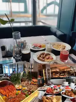 The breakfast is lavish. Stepping into the 58th floor, you're greeted with panoramic views of Lecong through floor-to-ceiling windows. The restaurant is exquisitely decorated with soft lighting, neatly arranged tables and chairs, and spacious seating. The seafood section is bursting with freshness, featuring a variety of sashimi, including salmon freshly sliced by the chef on the spot.