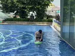 The next morning, the three of us went to the pool to play in the water. How can kids be happy without water play? The huge pool, with the hotel behind us, looks like we’re on a sailboat—perfect for photos! Of course, I took lots of snaps.