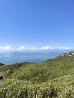 The next morning, we went to the Big and Small Tianhu Lakes. After packing and checking out, the host called a car for us; it cost 40 yuan per trip. The attraction ticket was 40 yuan plus 36 yuan for the park shuttle bus. After arriving at the mountain, you can store your luggage at the visitor center and then start hiking. The weather was great. It takes about half an hour to reach Small Tianhu Lake, which has the most beautiful scenery—half grassland, half sea. After viewing, we took the bus back to the pier. If you buy the boat ticket on WeChat a day in advance, it costs 95 yuan round trip. You can enter and exit the pier freely, for example, entering at Yujing and exiting at Sansha. Due to transportation on the island, you can also rent a car for 200 yuan on regular days, and 300 yuan during National Day. We checked out Moon Bay Beach on the ring road, but it wasn’t that great. So we went straight to the homestay to start our photo session.