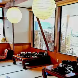 Take the red sightseeing bus and get off at stop 13 (Azagawa Onsen Town), then cross the street and you'll arrive. If you drive, there is parking in front of the shop. Inside the shop, there is both a tatami mat area - low seats for sitting on antique cushions and a zone with high tables in a modern style (but still looking Japanese style). The highlight is the wide glass windows showing off the lake view. If the weather is good, you should be able to see Mount Fuji faintly.