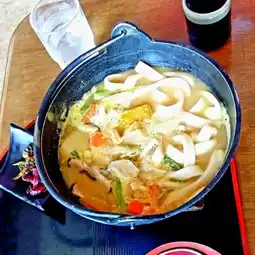 ➡️ Shingen Hoto Noodle in Pot – The most popular menu item in this area is Hoto Noodle. It is served at almost every restaurant. Houtou noodles are similar to udon noodles, but they are chewier and thicker because they have to be kneaded by hand. They are boiled in miso soup with 10 types of vegetables and served in a hot pot.