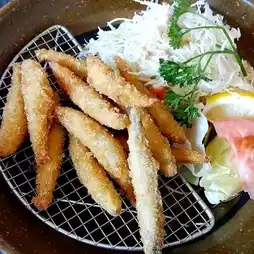 ➡️ Combo Meal with Fried Pond Smelt – Wakasagi or small freshwater fish are local foods here. Served in thin breadcrumbs, deep-fried until crispy and eaten whole, served with lemon and cabbage.