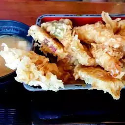 ➡️ Combo Meal Box with Tempura - is a tendon set served with miso soup, pickled vegetables, and dried seaweed sprinkled with sesame seeds. The tempura includes medium-sized shrimp and various vegetables. Deep-fried until crispy and hot