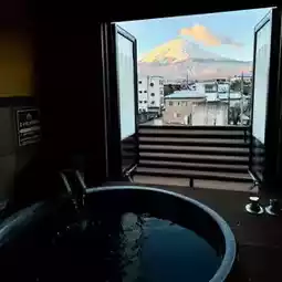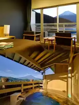 Another hot spring hotel with views of Mount Fuji and Lake Kawaguchi.🌄🏞️ Recommended room type: Japanese-style room with open-air hot spring.🛁 The room faces Mount Fuji, so you can take great photos📸 and don't have to worry about time limits in the public bath. The hotel has a viewing point on the top floor👀 where you can enjoy the stunning views of Mount Fuji.🌄