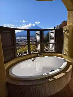 The room type booked this time is the Rose Double Room. The room has a terrace. There is a bathtub on the terrace🛁. You can enjoy the view of Mt. Fuji while taking a bath. But in the cold winter❄️, you need to muster up the courage to step out onto the terrace. When you wake up in the morning, you can walk to the terrace to enjoy the sunrise.