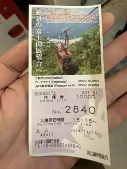 This trip to Lake Kawaguchi was a true visual and culinary delight. The date "2024/11/15" printed on my cable car ticket indicated that I was visiting in early autumn, with the mountain's maple leaves turning golden and orange, adding a vibrant hue to the landscape.