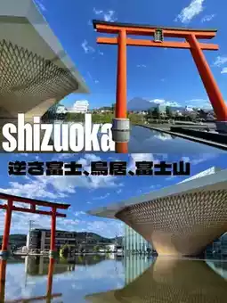 The vermilion torii gate, symbolizing entry into the realm of the gods, stands beside the World Heritage Center of Mount Fuji. The center cleverly adopts the shape of an inverted Mount Fuji, positioned symmetrically with the torii gate. Its water pool reflects Mount Fuji and the torii gate, creating an entrance to a sacred and surreal world.