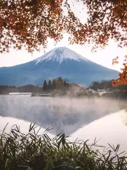 Autumn transforms Lake Tanuki into a breathtaking canvas. The majestic, often snow-capped peak of Mount Fuji is perfectly framed by the brilliant reds and golds of the surrounding autumn foliage, with the entire spectacular scene mirrored in the lake's calm waters . It's a photographer's paradise and a serene escape into Japan's most iconic landscape.