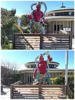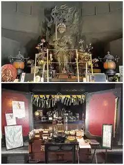 A 6m-tall red statue of Acala is enshrined as the principal image in the main hall. You are free to enter the main hall, and the smell of burning incense wafts through the air.