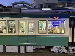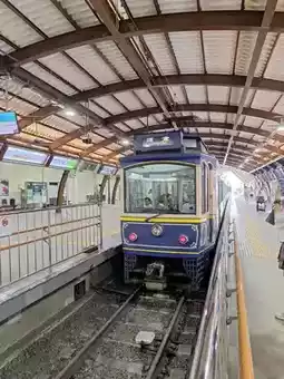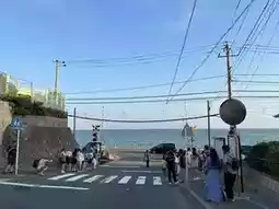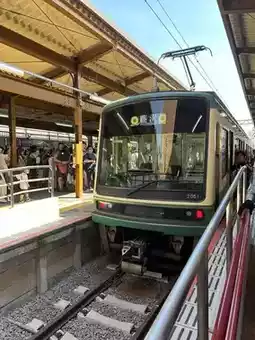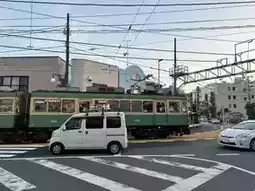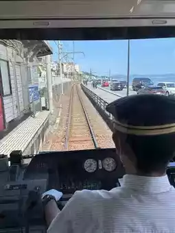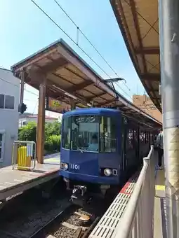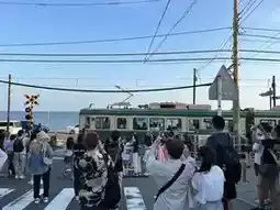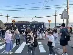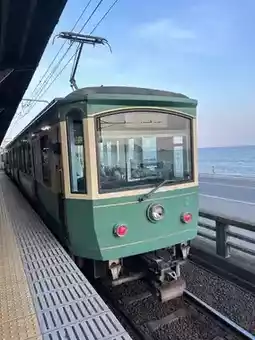 The reason we chose to stay near Fujisawa Station is to visit places along the route of the cute train, Enoden Train, or the full name Enoshima Electric Railway... Enoden Station is a separate station from JR Fujisawa. You have to walk through JR Fujisawa Station to the Odakyo Shonan Gate building. We chose to buy a one-day pass ticket for 800 yen because we intended to get on and off at each station, until Kamakura Station and back, which we thought was more worthwhile than paying per trip. Oh, and all stations on this route accept Visa and AMEX credit cards. If you don't have to put money in to buy a ticket or use an IC card, you can tap it with a credit card. At some stations, the credit card reader is next to the staff room, while at some stations, there is a separate card reader. The highlight of this train line is that it passes through houses, communities, and beaches. In some sections, the tracks merge with the road, showing that both cars and trains must take care of each other in order to run together.